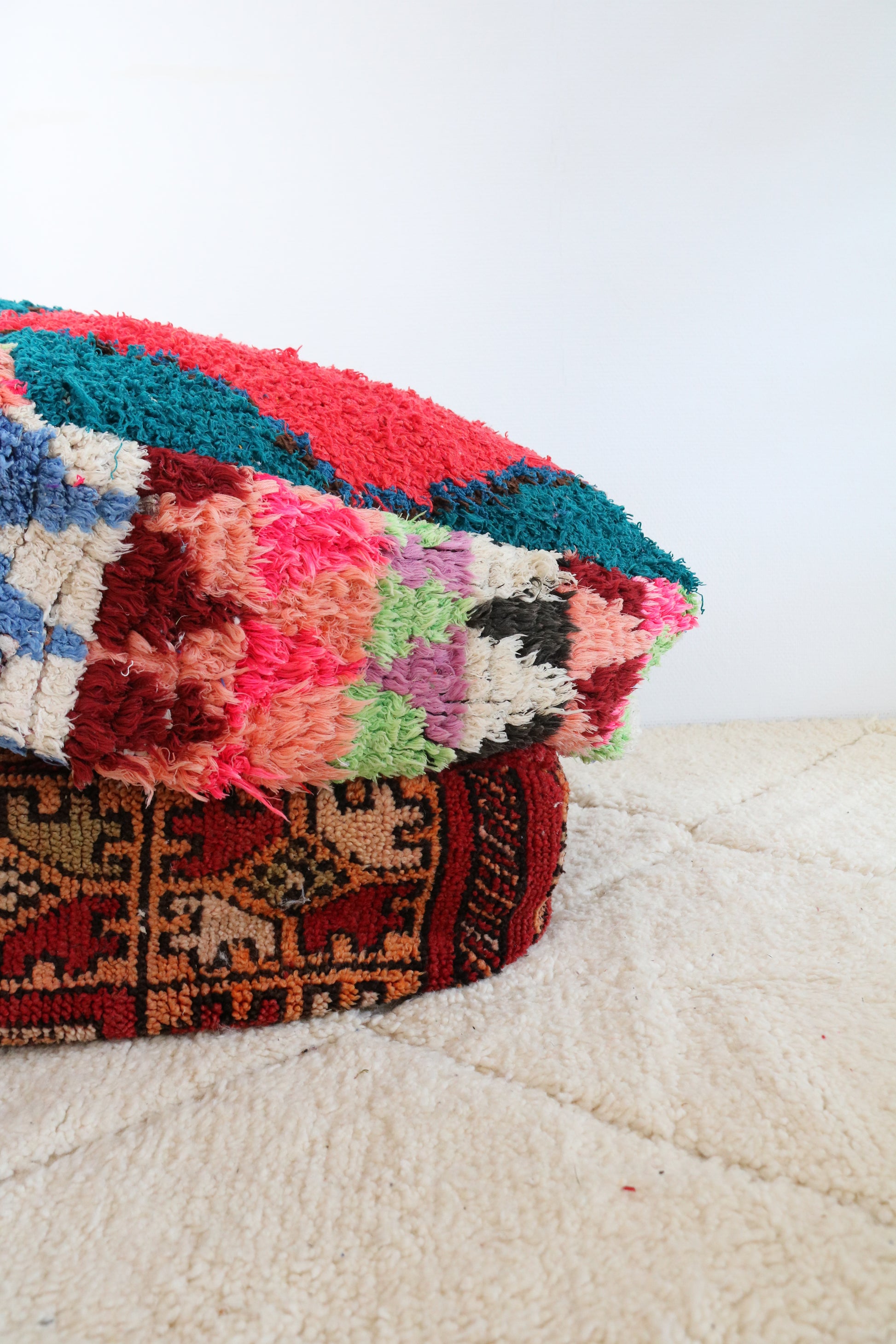 Geef je interieur een upgrade met een Marokkaans poef. Stuk voor stuk zijn alle Berber en Boujaad poefen uniek en handgemaakt in Marokko. Zorgvuldig uitgezocht tijdens een van onze reizen in het Atlasgebergte. Verkrijgbaar in verschillende kleuren en stijl, voor elk interieur een passend zitkussen.